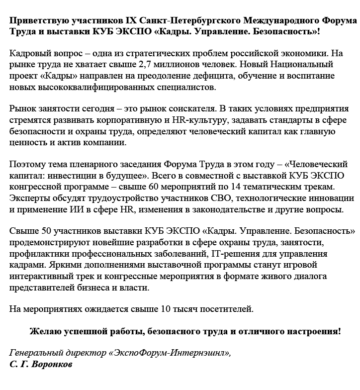 Читать приветствие генерального директора «ЭкспоФорум-Интернэшнл», Воронкова С. Г.